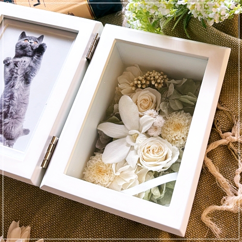 ナチュラル可愛いお花と一緒に、ペットの可愛いお気に入り写真を飾ってあげて下さい。