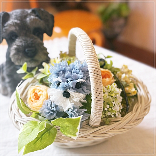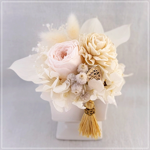 高級素材の造花を使ったお悔やみアレンジ。新しい供花スタイルで、ペットに合ったお花でお作りします。