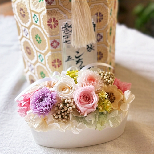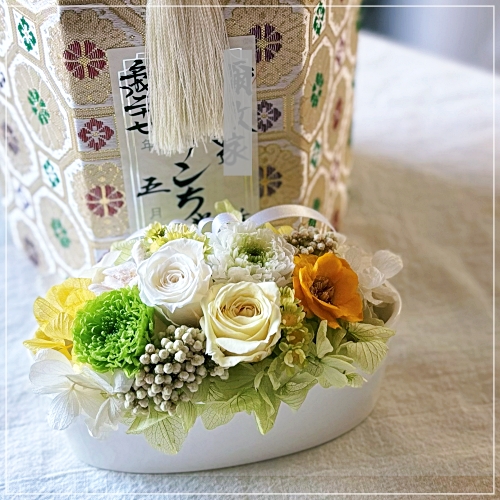 ケースにプリザーブドフラワーや小花をアレンジ。蓋をしたまま飾れるので埃を気にせず飾っていただけます。