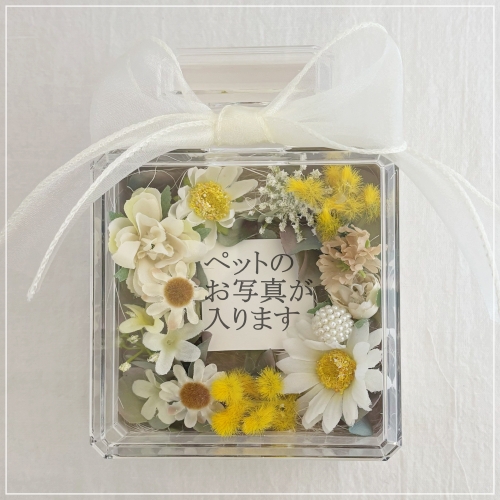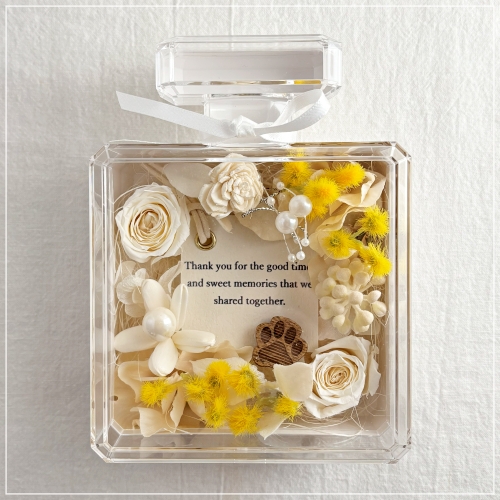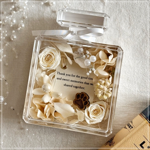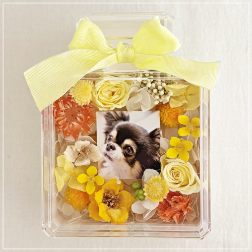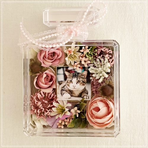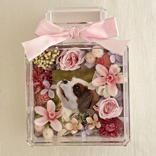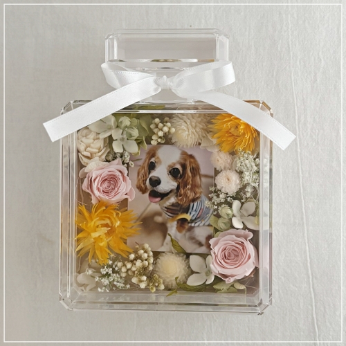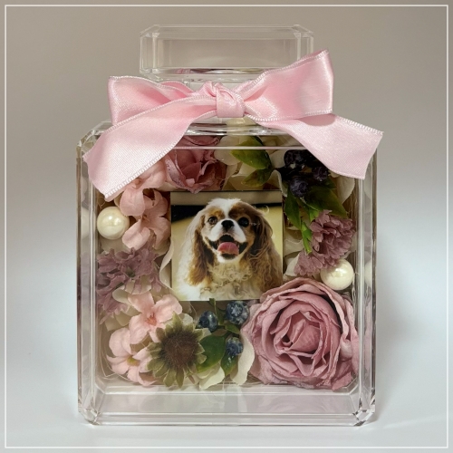 香水瓶をモチーフに、お洒落で透明感抜群のアクリルケースの中にペットの写真とお花をアレンジいたします。 サイズ:横10㎝高さ13.5㎝奥行6㎝
