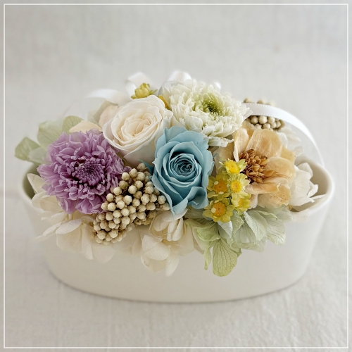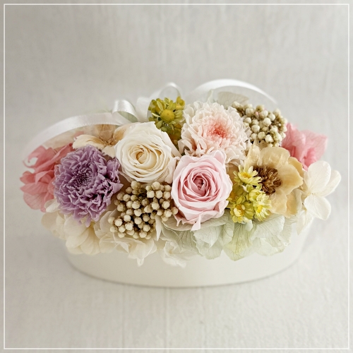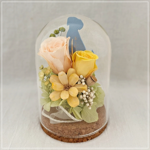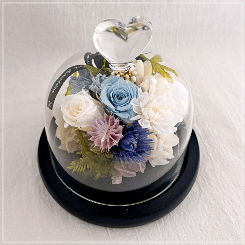 プリザーブドフラワーをガラスドームに閉じ込めたアレンジ。ドームが埃を防ぎ、より一層みずみずしい美しさが長持ちします。