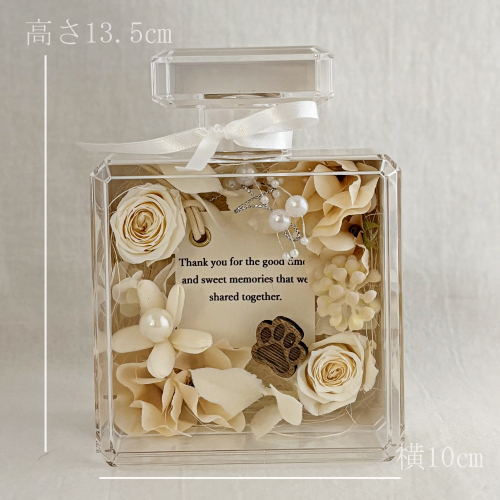 透明度の高いアクリルケースにお花をアレンジ。アンティークカラーで上質な雰囲気をかもしだし、華やかさの中に落ち着いた余韻で心も癒してくれます。品よく華やぎ、心に優しく寄り添う温もりのあるデザインに仕上げました。