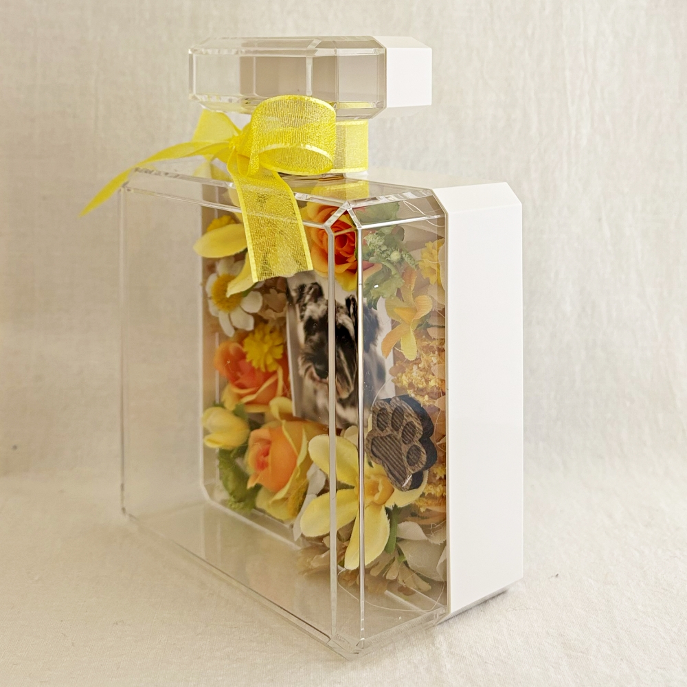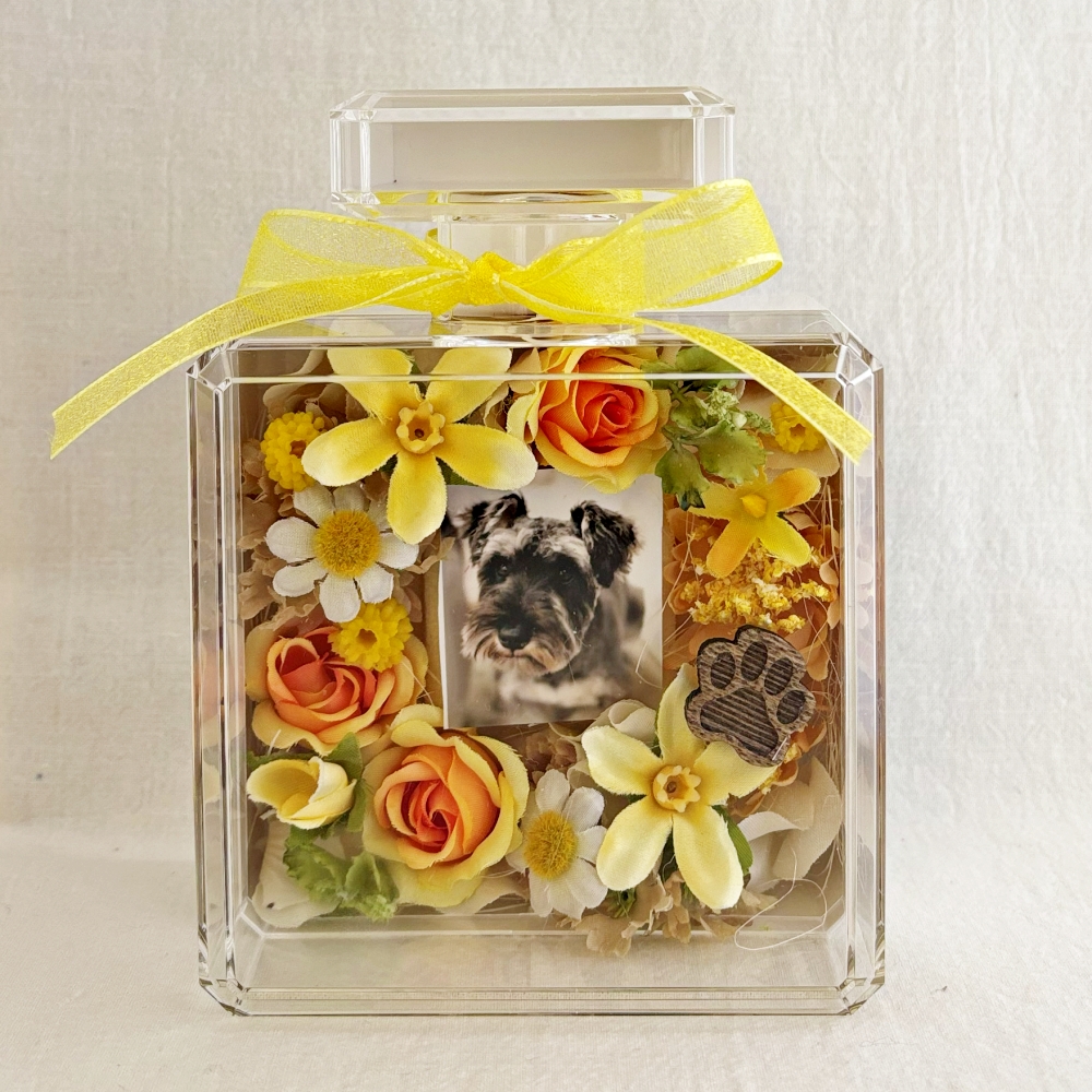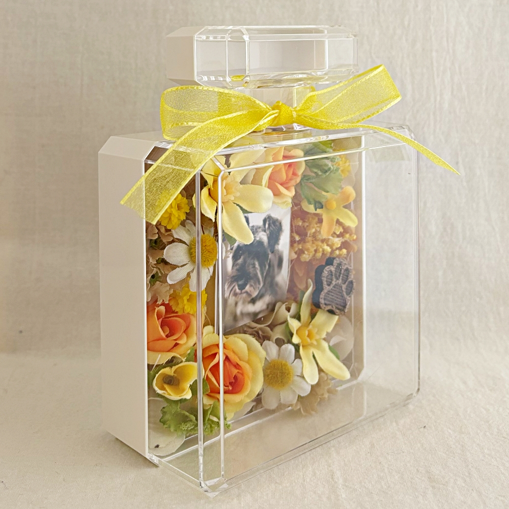 透明度の高いアクリルケースは多くの方から好評を得ています。お花はアーティフィシャルフラワーを使用。ビタミンカラーで可愛い雰囲気をかもしだし、華やかさの中に落ち着いた余韻で心も癒してくれるお悔やみギフト。心に優しく寄り添う温もりのあるデザインに仕上げました。