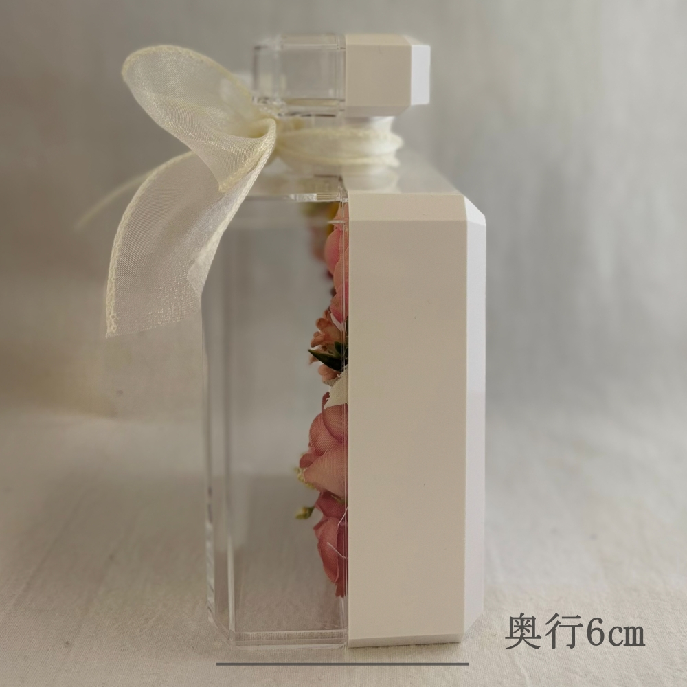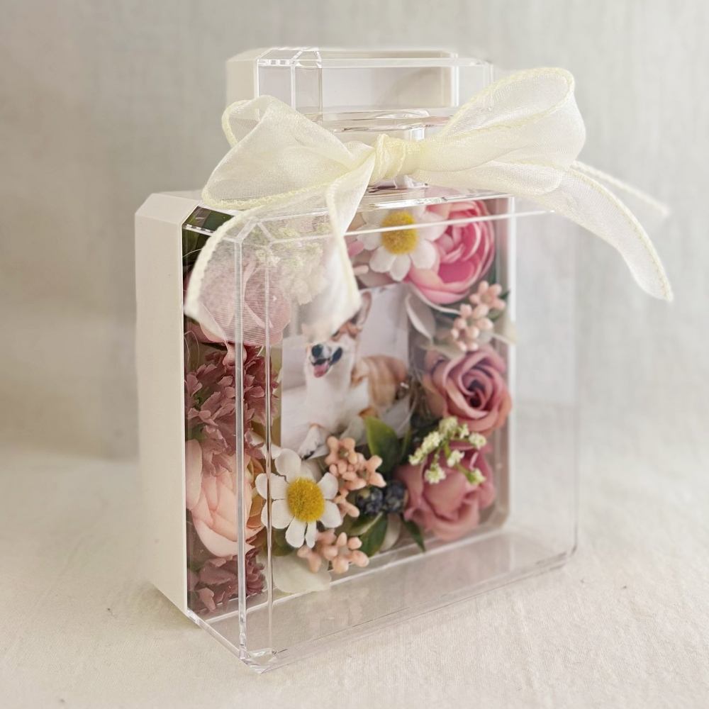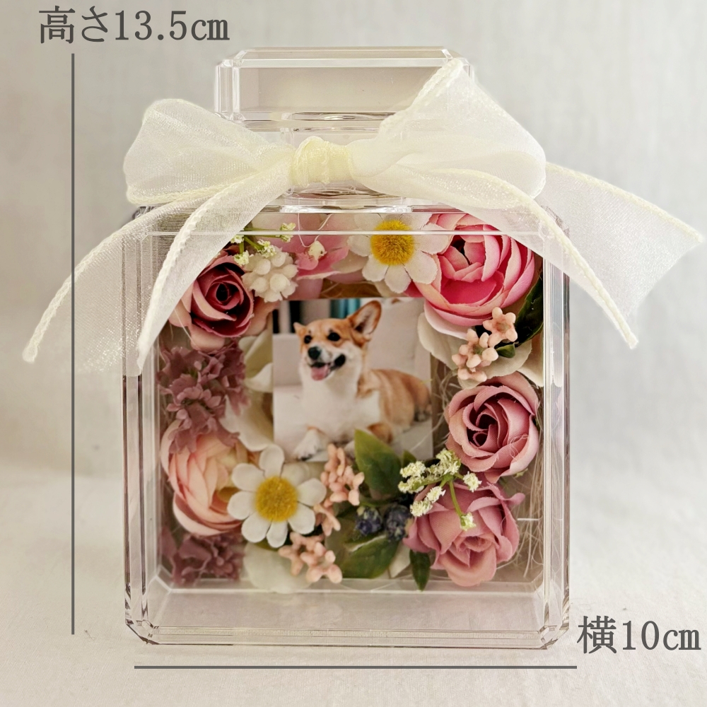 透明度の高いアクリルケースは多くの方から好評を得ています。お花はアーティフィシャルフラワーを使用。アンティークカラーで上質な雰囲気をかもしだし、華やかさの中に落ち着いた余韻で心も癒してくれるお悔やみギフト。心に優しく寄り添う温もりのあるデザインに仕上げました。