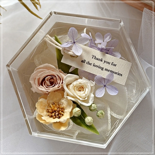 「愛情」「家族」の意味を持つ六角形のクリスタルボックスにお花とメッセージタグでお悔やみギフトを作ります。サイズ:横12㎝高さ10㎝奥行6㎝