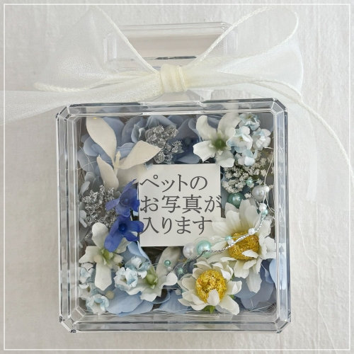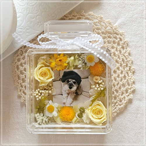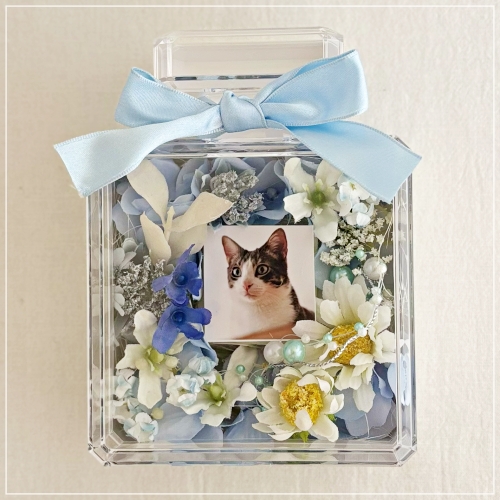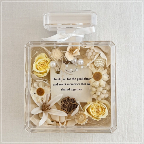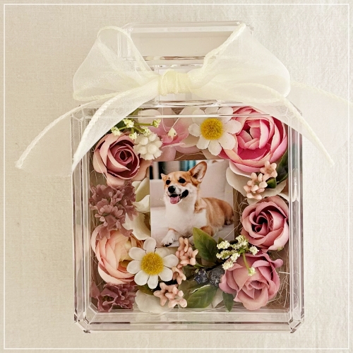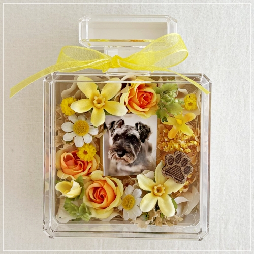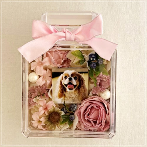 香水瓶をモチーフに、お洒落で透明感抜群のアクリルケースの中にペットの写真とお花をアレンジいたします。 サイズ:横10㎝高さ13.5㎝奥行6㎝