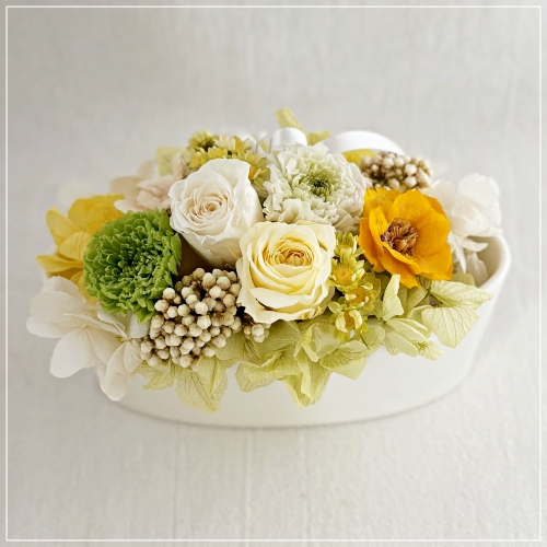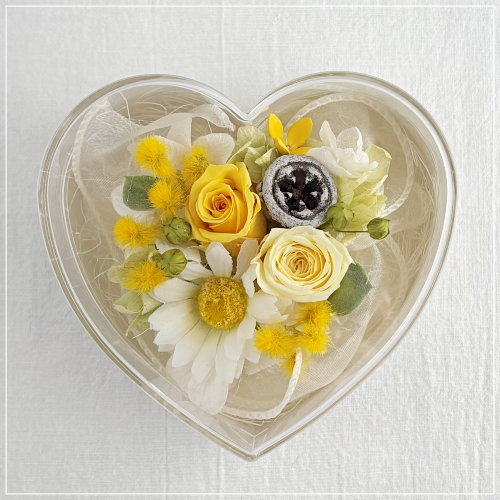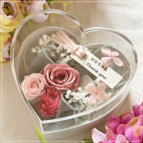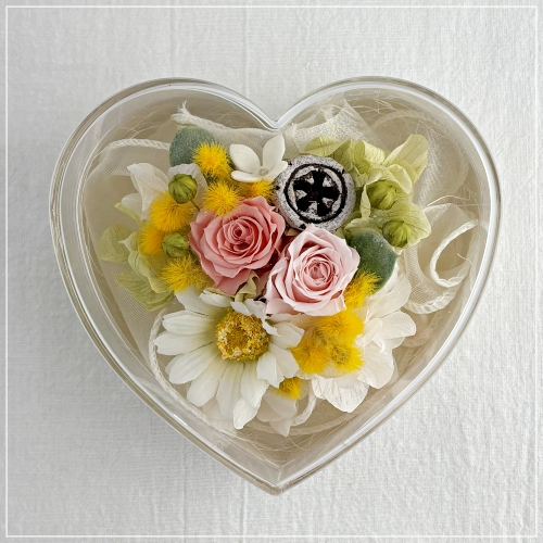 メモリアルギフトとして好評なカバー付きケース。ハートのケースにお花とメッセージをつけてお届けします。 サイズ:横11㎝高さ6㎝奥行10.5㎝
