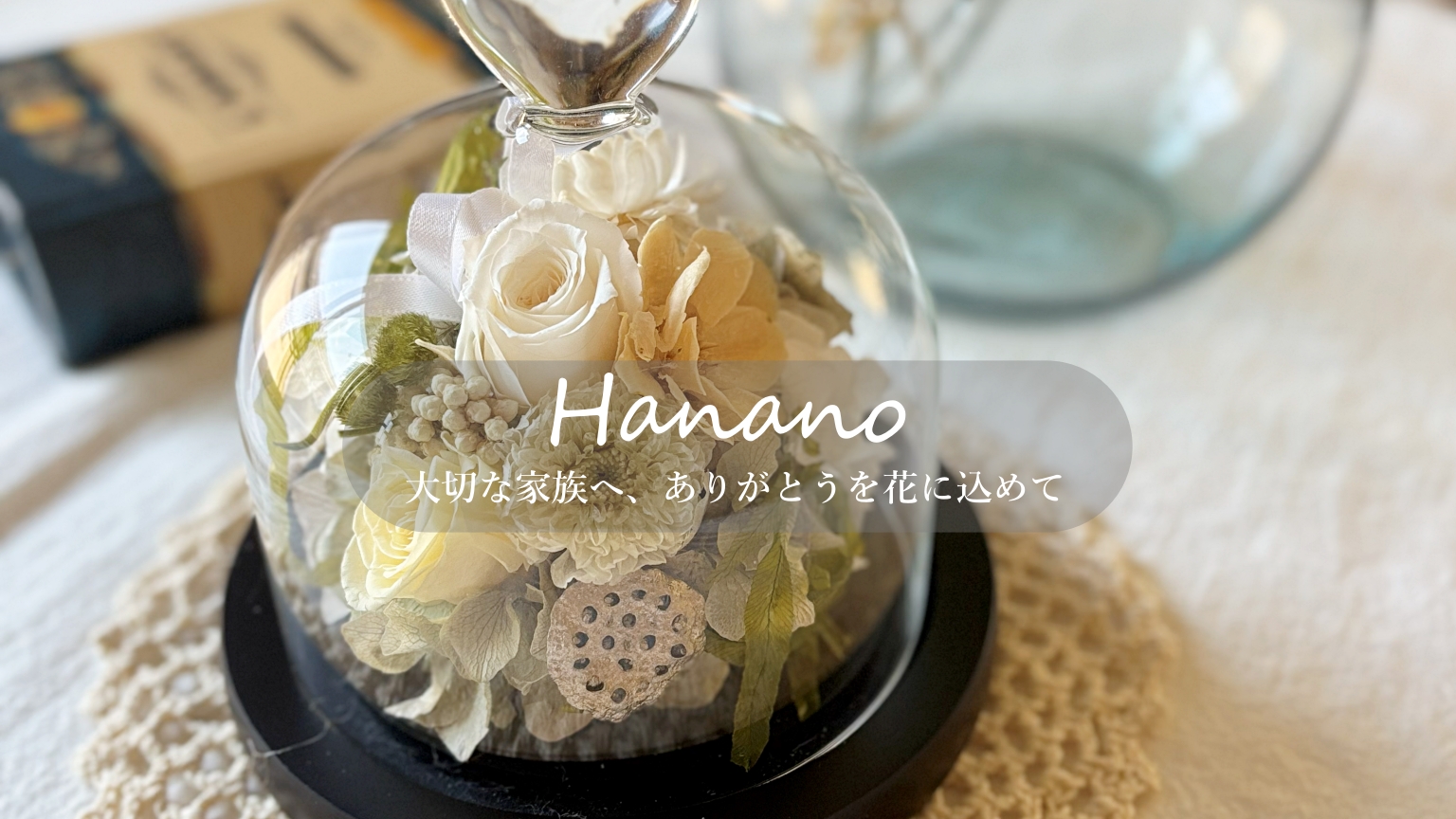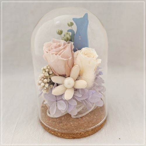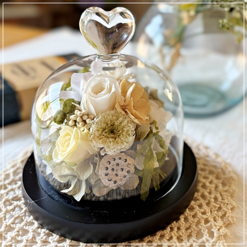 プリザーブドフラワーをガラスドームに閉じ込めたアレンジ。ドームが埃を防ぎ、より一層みずみずしい美しさが長持ちします。