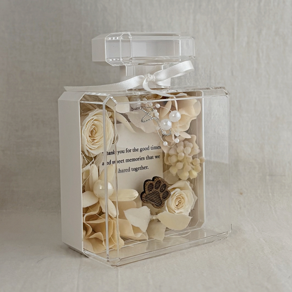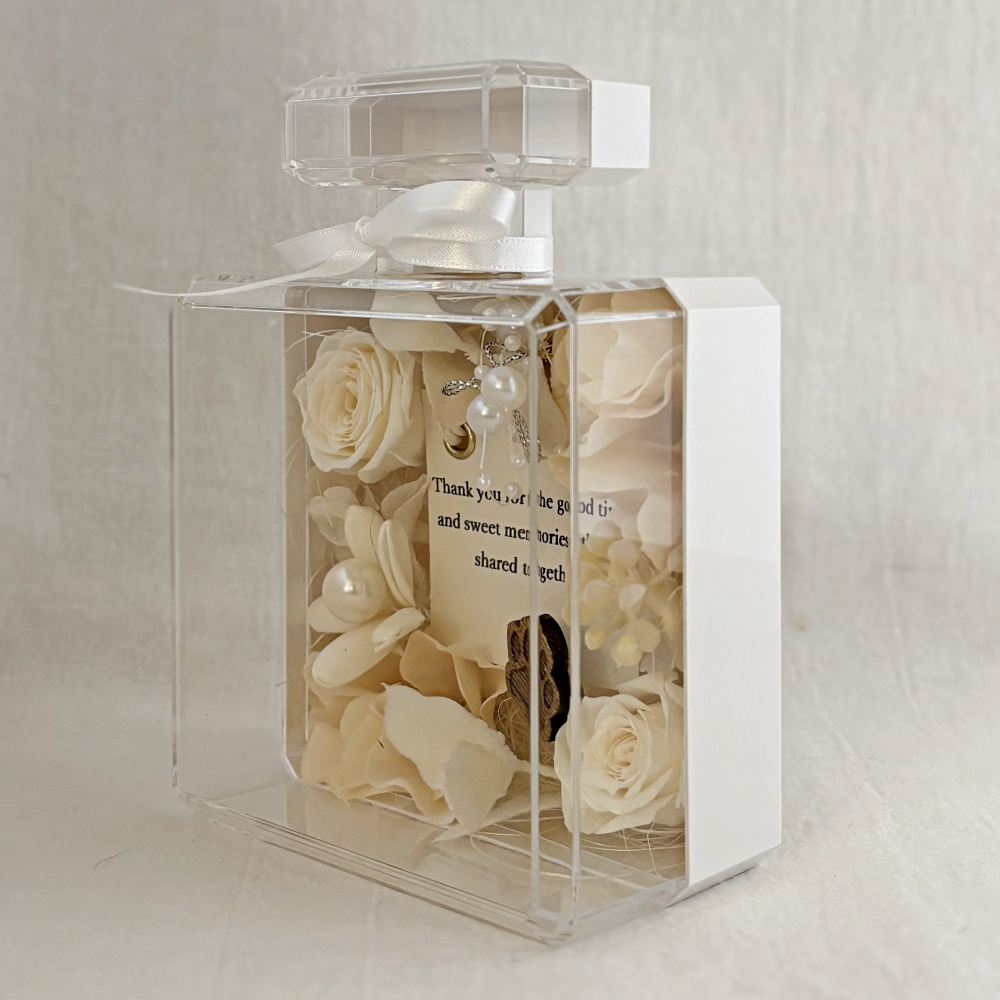 透明度の高いアクリルケースにお花をアレンジ。アンティークカラーで上質な雰囲気をかもしだし、華やかさの中に落ち着いた余韻で心も癒してくれます。品よく華やぎ、心に優しく寄り添う温もりのあるデザインに仕上げました。