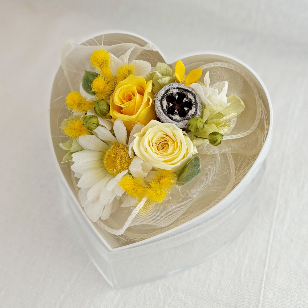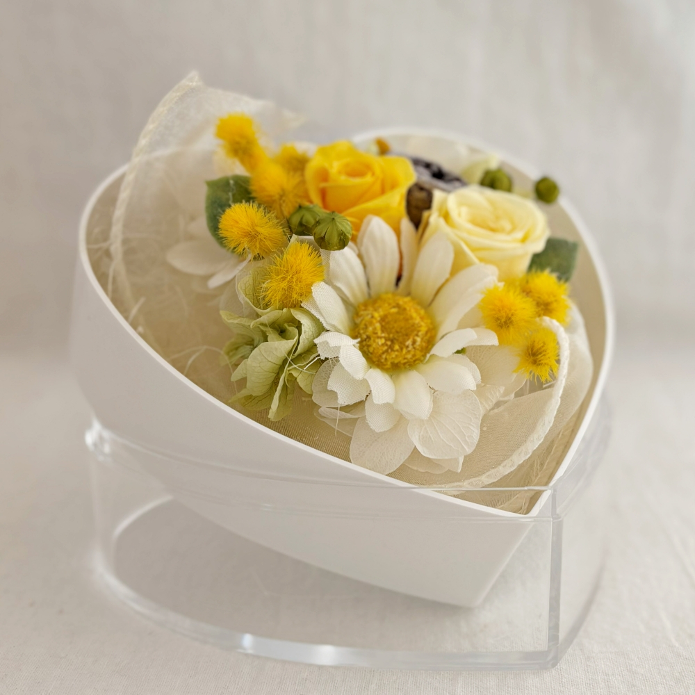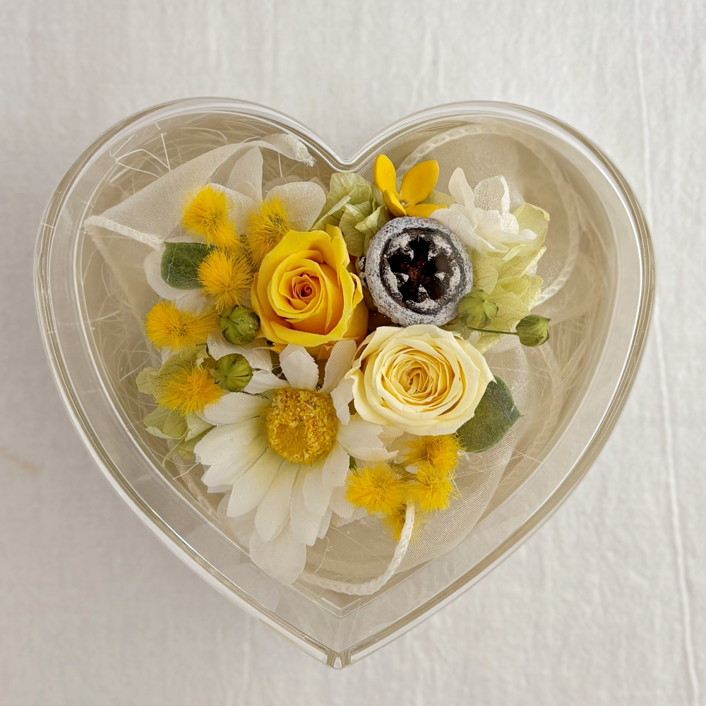 ・プリザーブドフラワーは非常にデリケートなお花です。手や物に触れると、花びらがつぶれたり切れたりする場合がございますので、お取り扱いにはご注意ください。