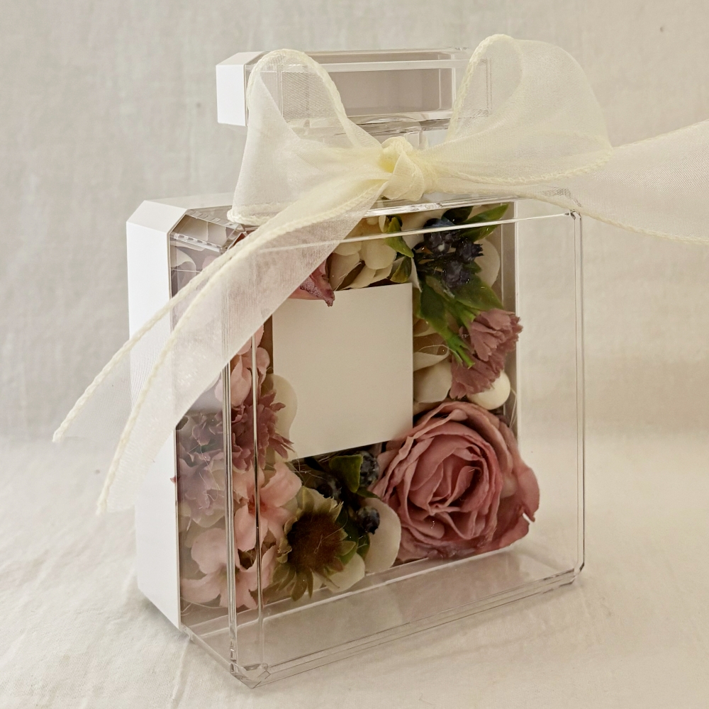 透明度の高いアクリルケースは多くの方から好評を得ています。お花はアーティフィシャルフラワーを使用。アンティークカラーで上質な雰囲気をかもしだし、華やかさの中に落ち着いた余韻で心も癒してくれるお悔やみギフト。心に優しく寄り添う温もりのあるデザインに仕上げました。