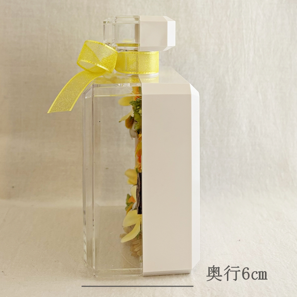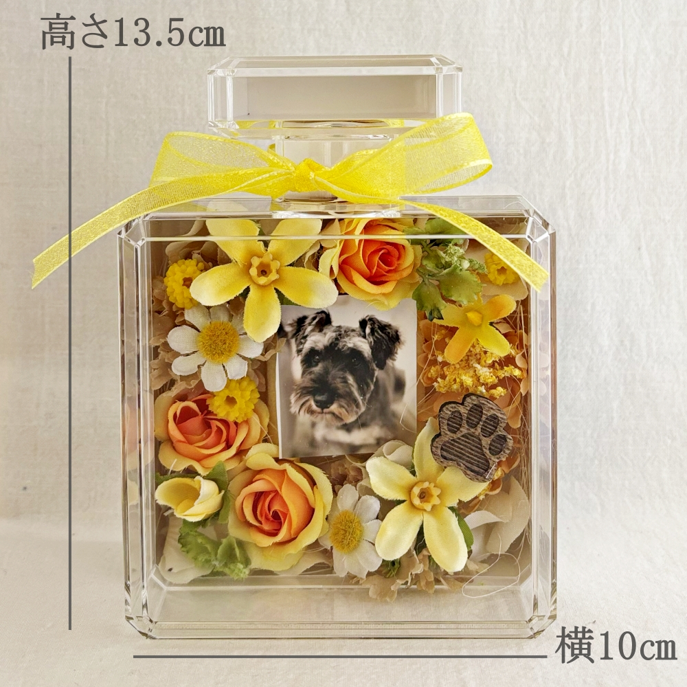 透明度の高いアクリルケースは多くの方から好評を得ています。お花はアーティフィシャルフラワーを使用。ビタミンカラーで可愛い雰囲気をかもしだし、華やかさの中に落ち着いた余韻で心も癒してくれるお悔やみギフト。心に優しく寄り添う温もりのあるデザインに仕上げました。