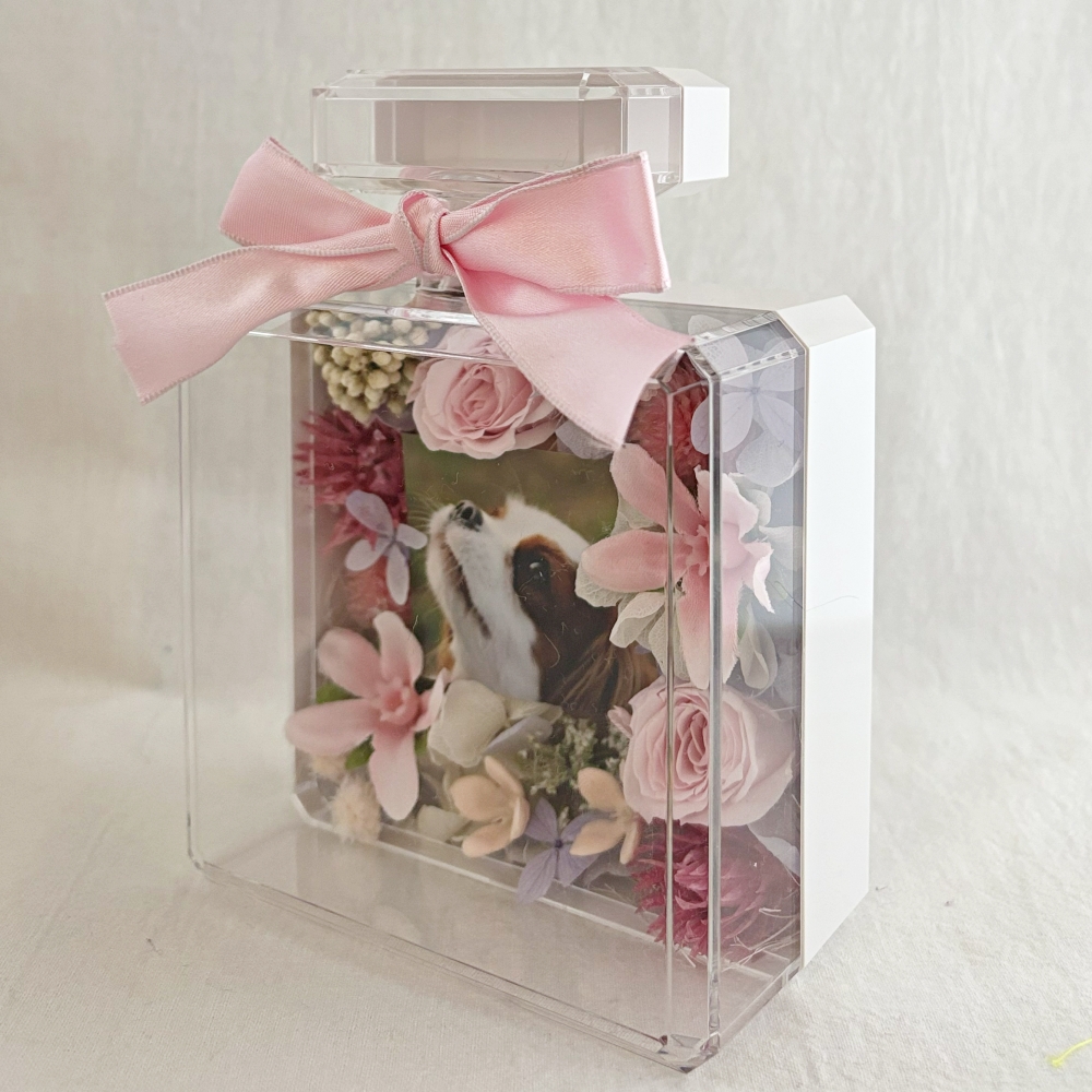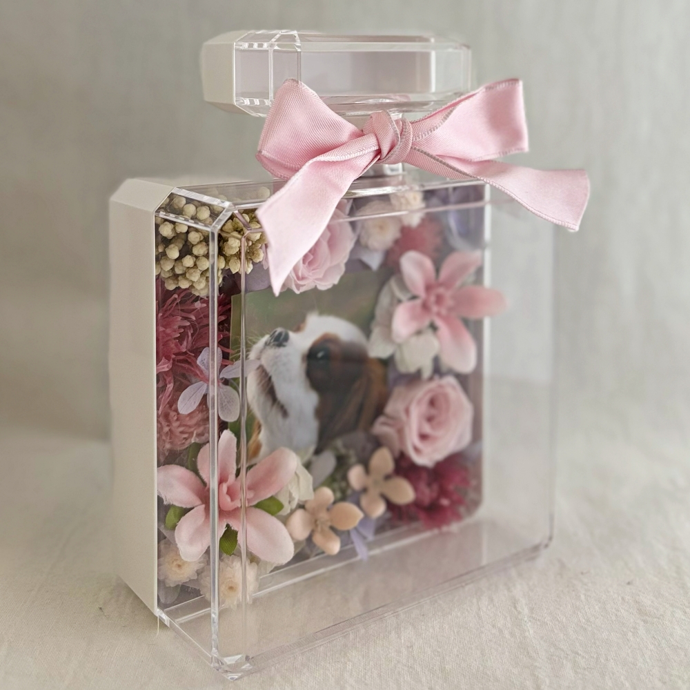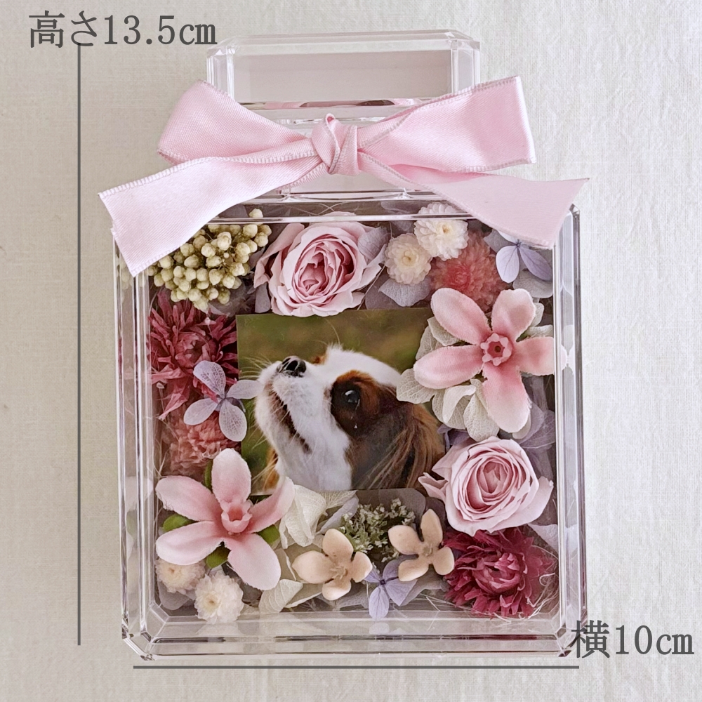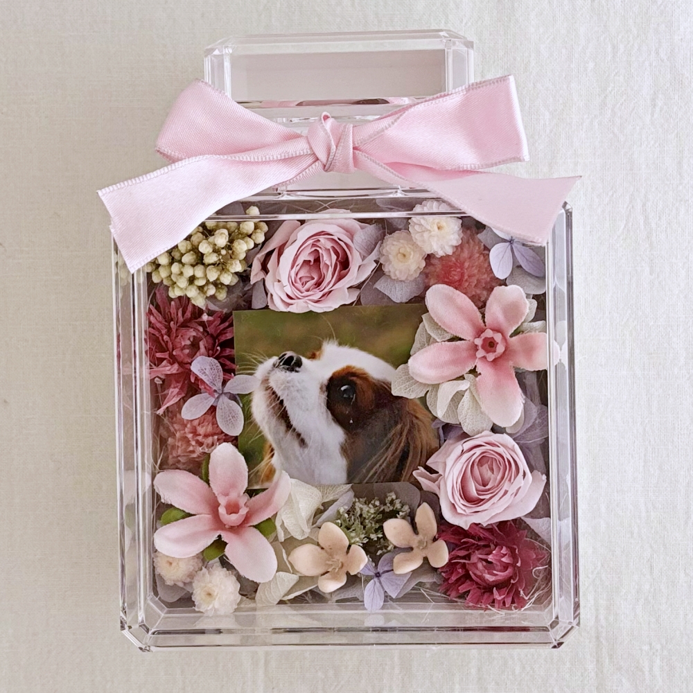 透明度の高いアクリルケースは多くの方から好評を得ています。お花はアーティフィシャルフラワーを使用。ビタミンカラーで可愛い雰囲気をかもしだし、華やかさの中に落ち着いた余韻で心も癒してくれるお悔やみギフト。心に優しく寄り添う温もりのあるデザインに仕上げました。